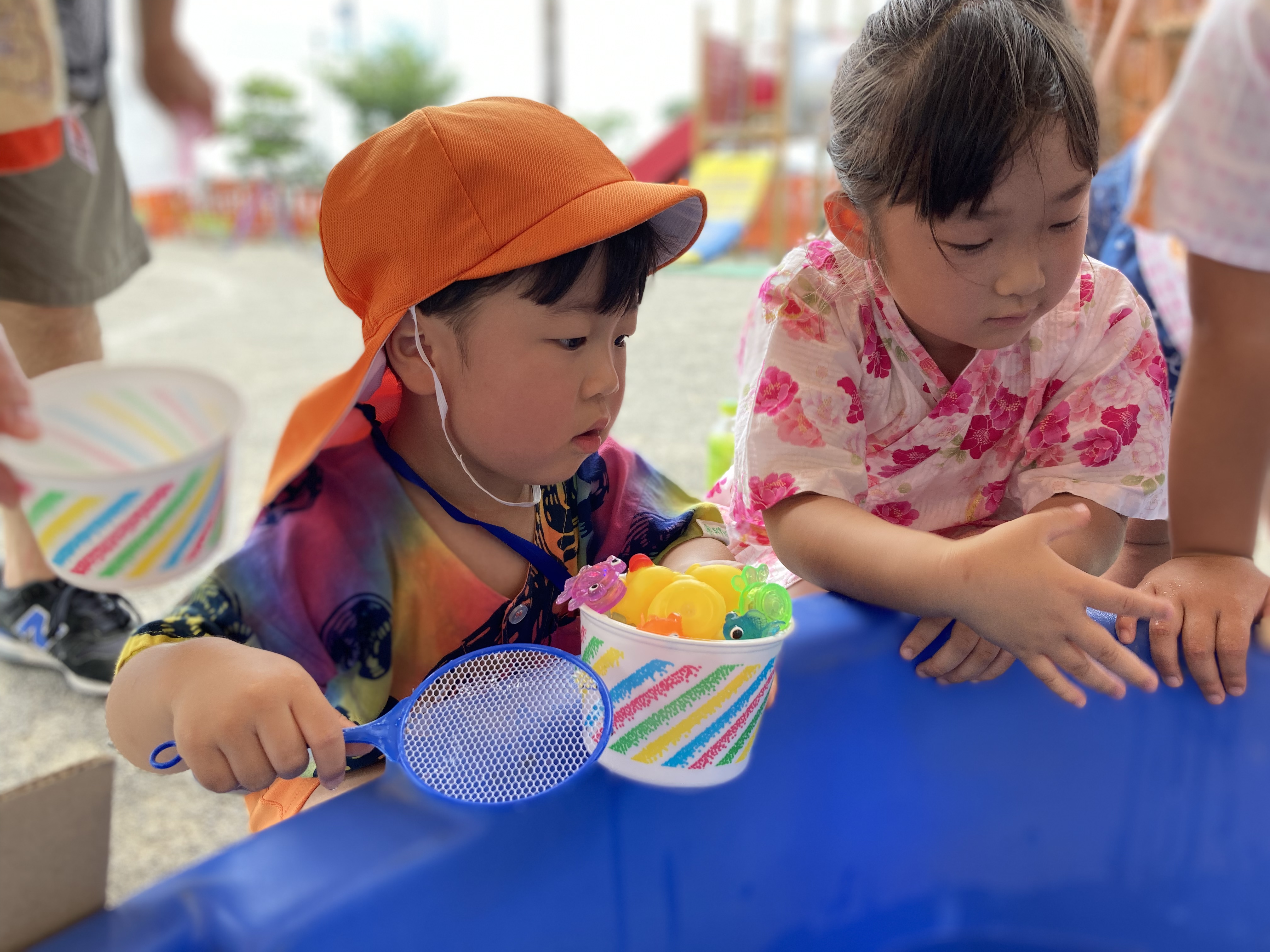 どんぐり組、つくし組のお友達も、お部屋の前で先生と一緒に金魚すくいをたのしみました。